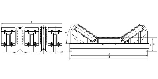 型號 | 適用 帶寬 | H1 | H2 | L | A | B | θ | 托輥直徑 | 緩沖條數 | 托輥組數 |